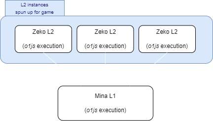 To solve points (1) and (2), we've partnered with Zeko Labs who is building a L2 for Mina that behaves just like Mina L1 (meaning any contract on Mina L1 can work as-is on the Mina L2. This is sometimes called "isomorphic" and behaves like a type-2 rollup in the Vitalik definition of rollup types). Zeko works perfectly for our use-case as it allows spinning up new instances of Mina as needed all with the same execution environment that are all recursively proven down to the Mina L1. These Zeko L2s can additionally have faster block times and finality than Mina L1, allow us to tune the parameters as needed for gaming.