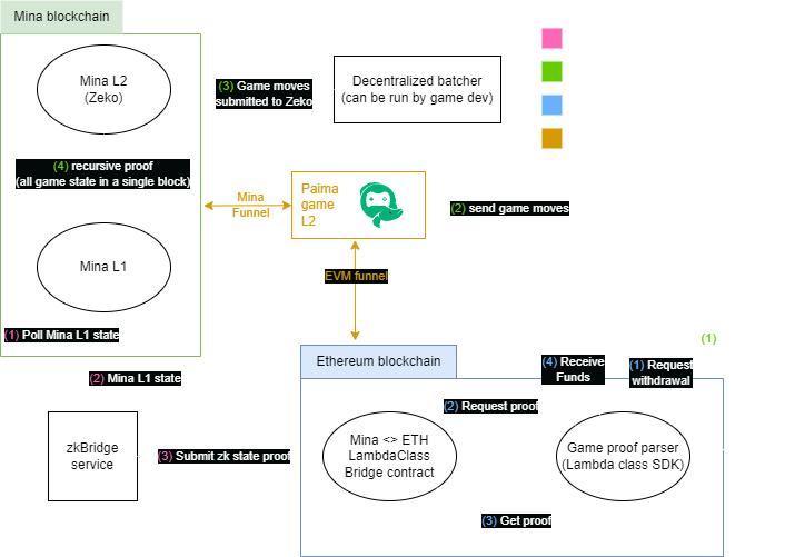 To solve (3) we need to build account abstraction inside Mina protocol to allow people from other blockchains to play without owning a Mina wallet. To enable this, we will combine Paima's existing account abstraction framework with circuits written in Mina for common cryptographic standards like ed25519 and secp256k1 (many of these standards like those for EVM already being available in Mina). With this, we can allow players to delegate their actions to a Mina wallet created for them that we can link back to their original wallet on their original chain. To bring state back to the user's original chain, we leverage the fact that all Zeko L2s settle to the Mina L1 whose entire history can be compressed into a single proofs (thanks to recursive SNARKs) and sent to be verified on any EVM chains using the LambdaClass zkBridge.