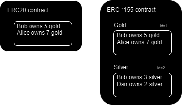 Instead, we use ERC1155. ERC1155 is a way to combine multiple fungible tokens into a single contract (ex: instead of having both a gold ERC20 contract and a silver ERC20 contract, you would instead have a single ERC-1155 that contains both a gold asset and a silver asset).