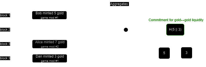 Since the game can monitor activities on the common liquidity layer (using projections in general as discussed here), games can actively reward liquidity providers with new gold in-game for providing liquidity on this pair. This acts as a reward for the staker for timely updates of their commitment to ensure newly minted gold can always quickly be transferred into old gold as needed to facilitate trading.