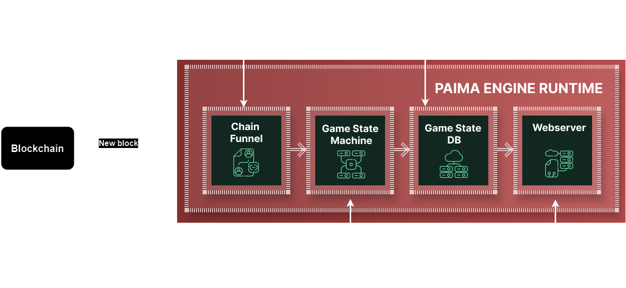 Paima calls the system to pull in and aggregate state from different chains funnels and currently has funnels for both EVM and Cardano. This funnel system can be extended to support other networks in the future to increase the number of ecosystems Paima (and therefore Mina) can target. Importantly, everything from the data the funnel pulls to how it is processed in the state machine has to be deterministic for the same reason smart contracts have to be deterministic. That means these funnels are not arbitrary oracles, but rather a way to feed deterministically-derived state into the state machine in a unified data format.