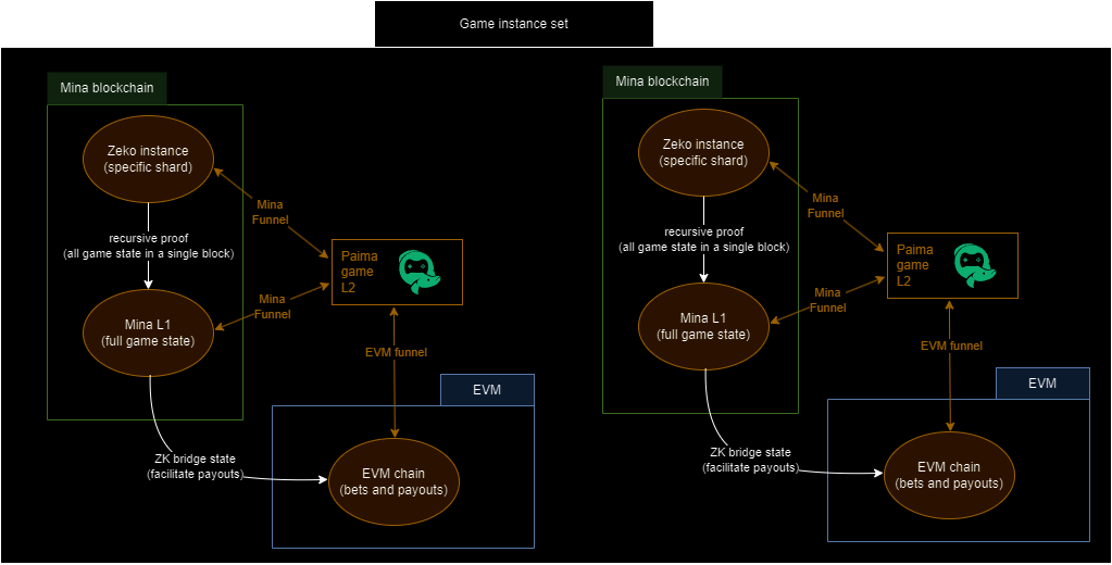 With these components in place, games can be built where the user deposits their funds on Ethereum in a PVP match with the ZK proof of who won the match being used to unlock the rewards for the winner. In fact, the game state can be used to prove the PVP battle result on any chain that has a zkBridge with Mina. Thanks to the properties of Mina's recursive SNARKs and Paima's architecture, bridging Mina state to another chain does not require any opt-in from the Mina side - meaning anybody who wants to build a game can deploy their own zkBridge to the chain they're interested in deploying their game to without any permission or changes required from Mina itself (Mina essentially acting as ZK coprocessor for all blockchains) making our construction fairly universal.