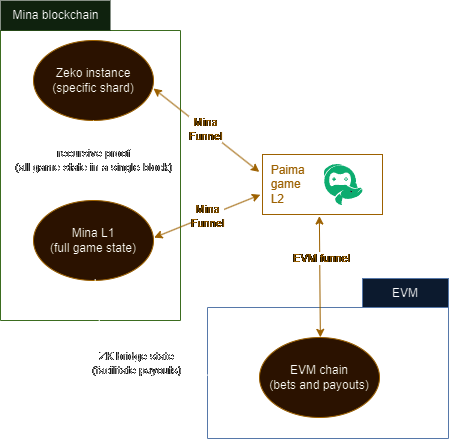 Typically this kind of construction is extremely difficult as a game developer to deal with from an engineering perspective, as it means developers now need to be a domain expert in both Ethereum (or other L1) and Mina and wrangle multiple different sets of developers tools and indexers in parallel. However, Paima applications written with Paima allow developers to write a single state machine that computes on top of aggregate state from multiple chains - essentially supporting mixed-mode computation where parts of the game logic live in Solidity and other parts live in Mina. This hugely simplifies the developer experience and makes leveraging ZK on large L1 networks like Cardano, Ethereum (or even Arbitrum) possible without having to resort to isolated ZK environments that do not compose with the rest of the ecosystem.